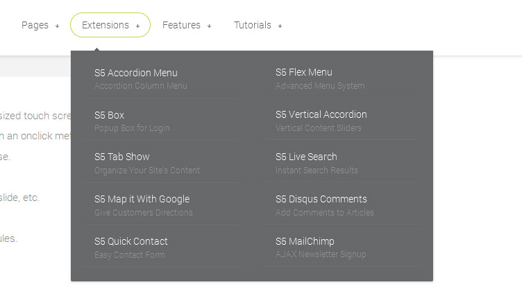 Take your website to the next design level by using the robust and feature rich S5 Flex Menu System. Organize your links with ease and show content in places you never could before!